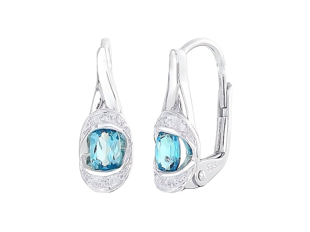 Kvalitní náušnice ze 14-ti karátového zlata bílé barvy. Zdobeno přírodními kameny:Brilianty SI/H 12ks/0,03ctTopaz 2ks/0,61ctVelikost topazu: 3x5mmDodáváme také prsten a přívěsek ve stejném designu.Certifikát pravosti včetně luxusního balení je samozřejmostí. Vyrobeno mistry klenotnického umění.ID: 8Doplňkové parametry