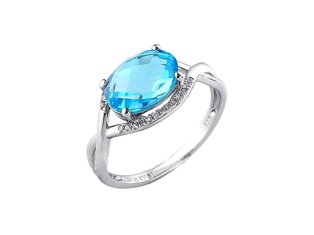 Kvalitní prsten ze 14-ti karátového zlata bílé barvy. Zdobeno přírodními kameny:Brilianty SI/H 26ks/0,08ct Blue topaz 1ks/2,75ctVelikost topazu 7x10mmCertifikát pravosti a luxusní balení je samozřejmostí. Vyrobeno mistry klenotnického umění.Dodáváme také náušnice i přívěsek ve stejném designu.Zvolte prosím velikost v tabulce.ID: 8Doplňkové parametry